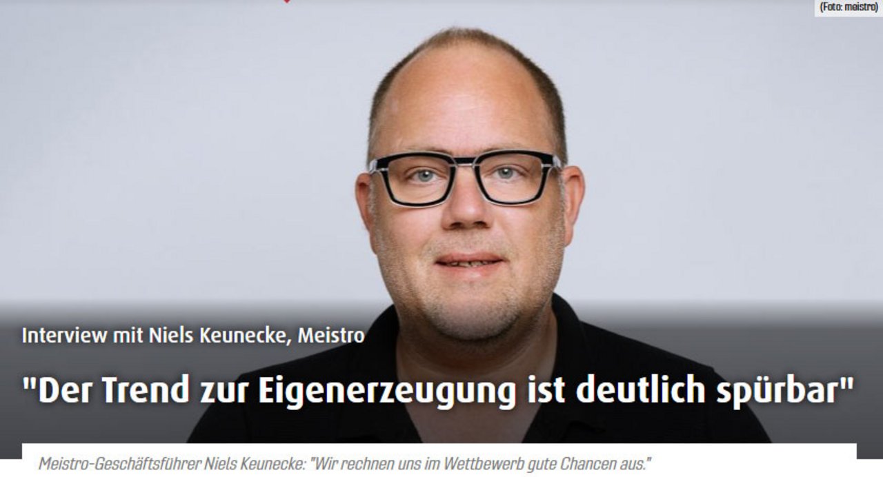 Hier finden Sie ausgewählte Presseberichte, Artikel und Veröffentlichungen über meistro. Ob in Fachzeitschriften, Online-Magazinen oder regionalen Medien – wir freuen uns, wenn über unser Engagement für nachhaltige Energieversorgung und unsere Arbeit als 360 Grad-Energiepartner berichtet wird. In dieser Rubrik sammeln wir Beiträge, die zeigen, wie meistro in der öffentlichen Wahrnehmung vertreten ist.